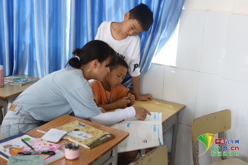 图为志愿者细心地为孩子辅导暑假作业。中国青年网通讯员 唐建忠 摄
