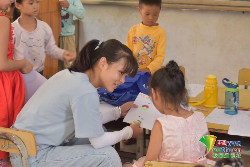 图为绘画课上,志愿者表扬孩子的创造力,讲述“奇思幻想”世界的精彩。中国青年网通讯员 唐建忠 摄