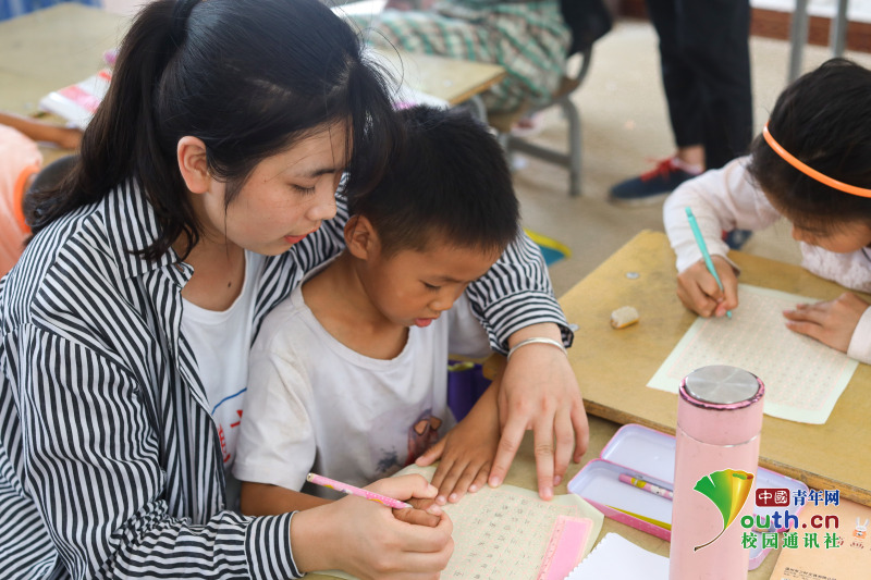 图为志愿者教孩子们硬笔书法,弘扬中国传统文化。中国青年网通讯员 唐建忠 摄