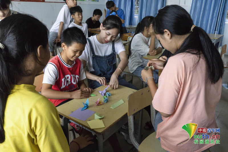 图为志愿者陪伴孩子们一起制作手工作品。中国青年网通讯员 唐建忠 摄
