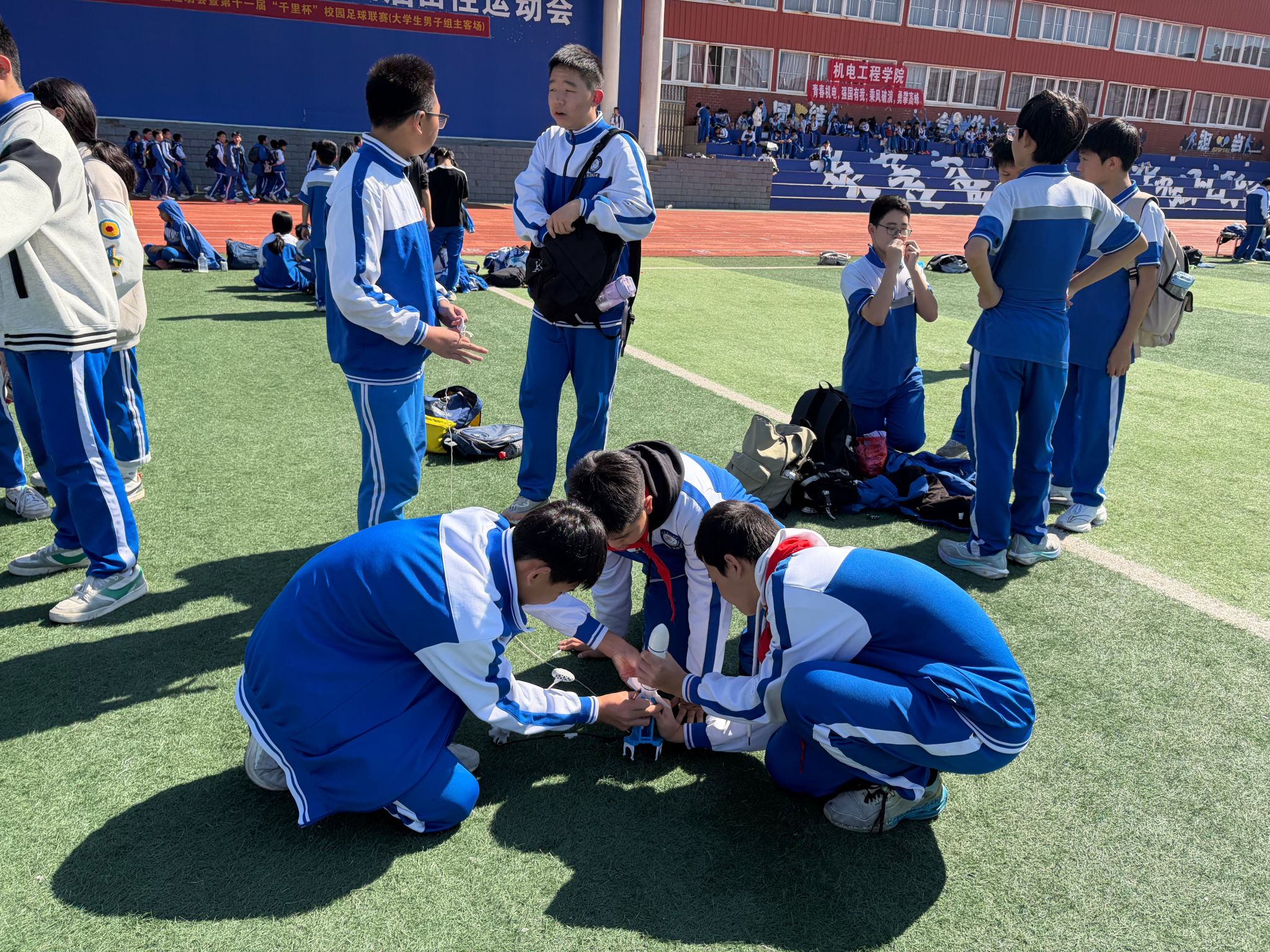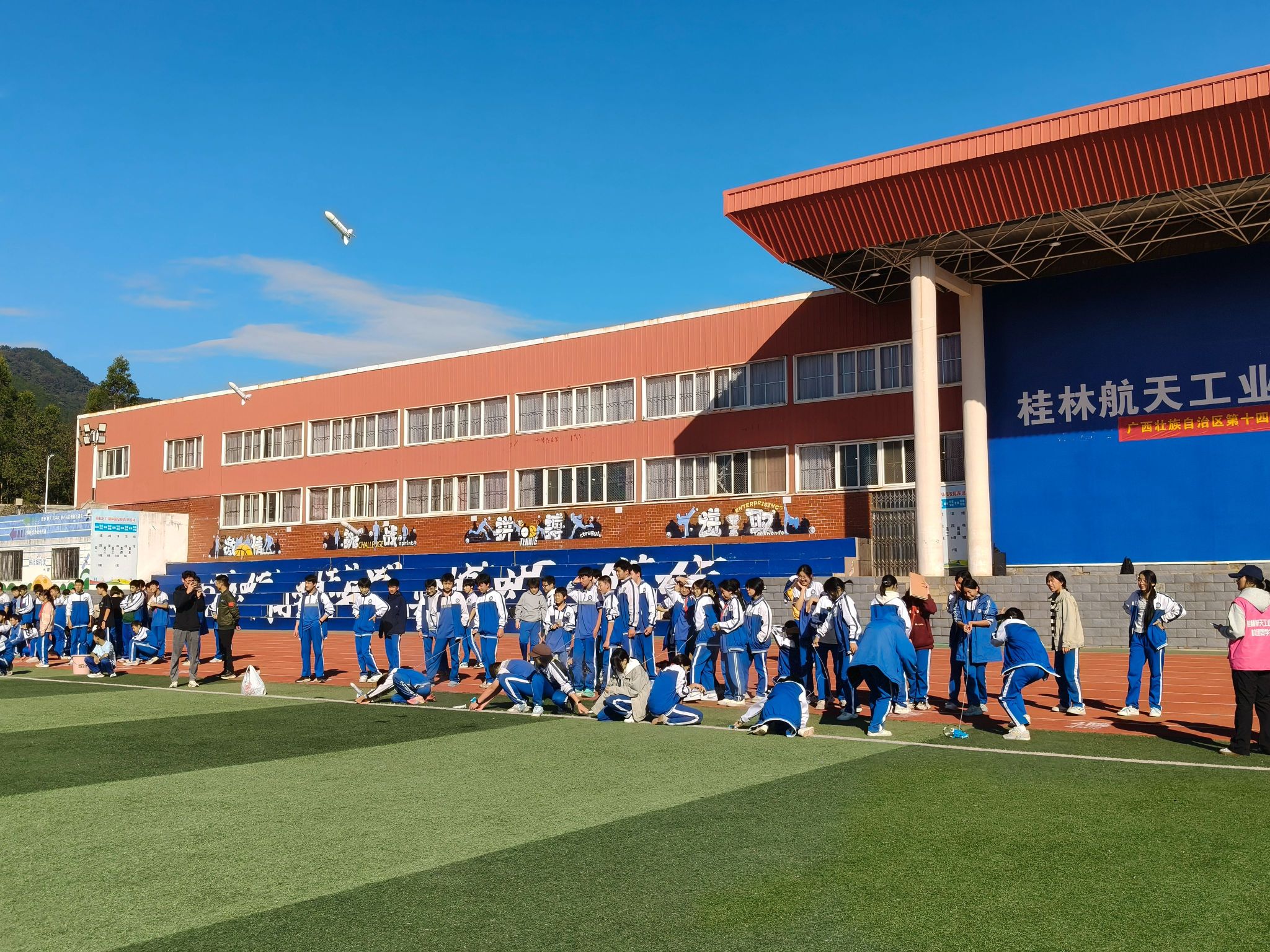 活动当天,同学们在志愿者的带领下分成八组,以不同路线有序开启行程。首先,第一小组、第二小组分别参观我校航天博物馆以及钱学森雕像,在回望我国航空航天事业发展历程中,深刻感悟的航天精神;其余小组则以火箭发展史、航空背景课为起点,大家沉积于生动的理论讲解,对航空航天知识有着更深刻的了解。每一个环节的精心设计,深刻激励着同学们向往蓝天的梦想。午间稍作休息后,同学们开始对火箭知识进行探索实践。首先,大家解锁无人机奥秘,拆解技术原理;随后参与火箭组装,亲手完成水火箭发射,让航天知识从书本落到现实;风雨足球场的航模飞行表演更是让航天知识生动可感。活动最后,同学们在飞天楼“我们的目标是星辰大海”处合影留念。