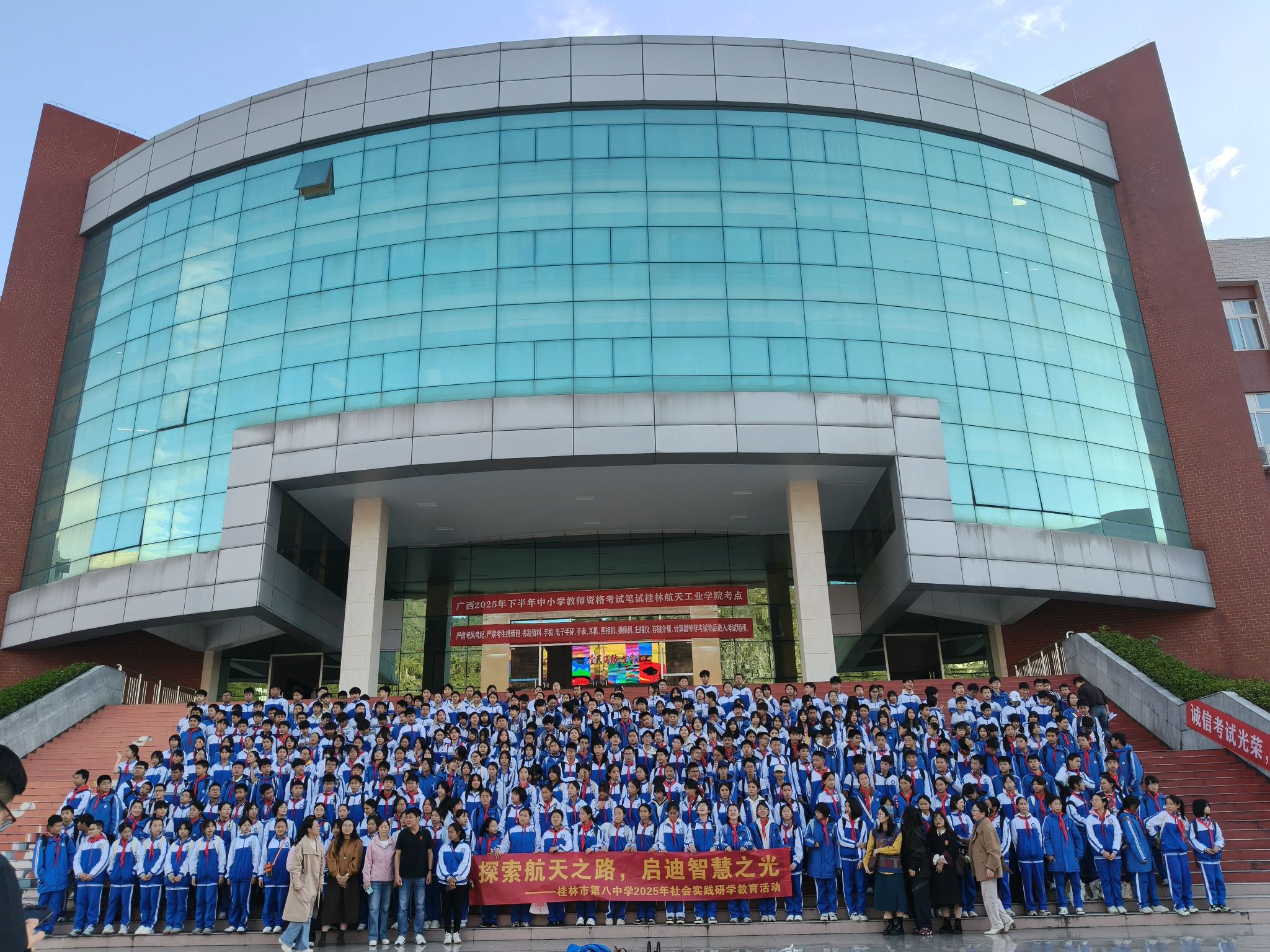 为了进一步激发孩子们对航空航天领域的好奇心与探索欲,培养他们的创新思维和动手实践能力。桂林八中的四百余名师生于2025年11月13日来到我校开展了一场以“探索航天之路,启迪智慧之光”为主题的研学活动。