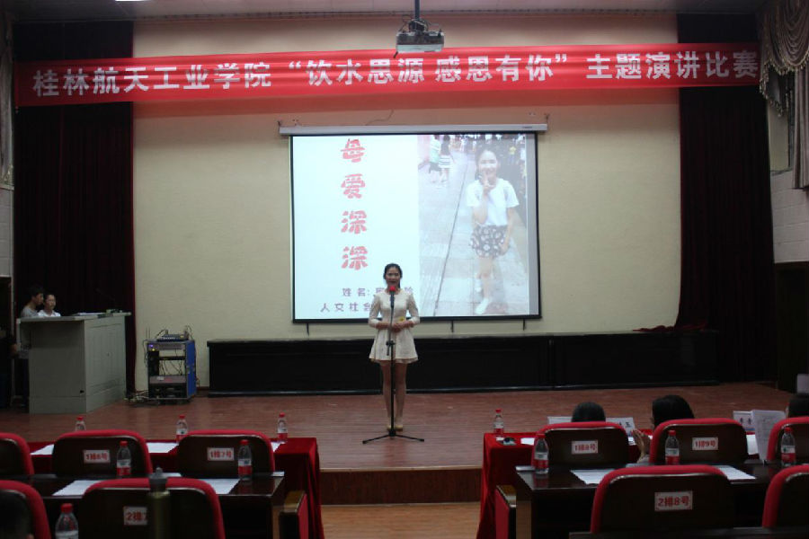 4月17号19:00,由我院团委、学工处主办的桂林航院“饮水思源,感恩有你”主题演讲比赛在电教一举行。本次比赛担任评委的有院团委指导老师李中焘、文璇,学工处徐洁玉老师、李青青老师以及党委宣传部徐艺萍老师,并且邀请了学院各系的学生代表观看比赛。
