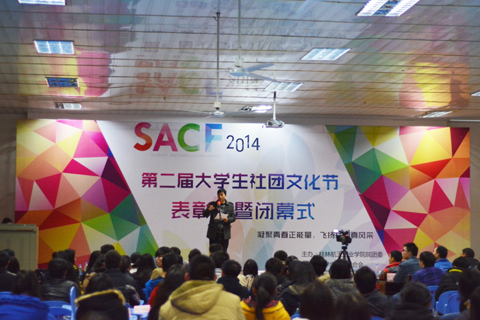 2014年12月13日19:30分,有由社团联主办的第二届社团文化节闭幕式在招聘大厅如期举行。莅临本次活动的嘉宾有杨永昌书记、学工部副部长杨华老师、院团委李中焘老师、信息部工程系团委书记朱吴生老师、外语系团委书记陶意敏老师、工商管理系团委书记孙建东老师、张宝磊老师和马楠老师,以及九大校级组织与45个社团的代表。