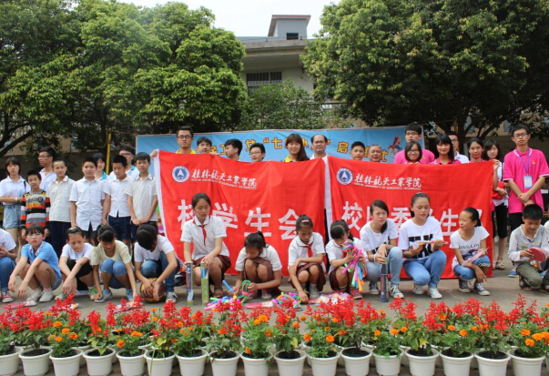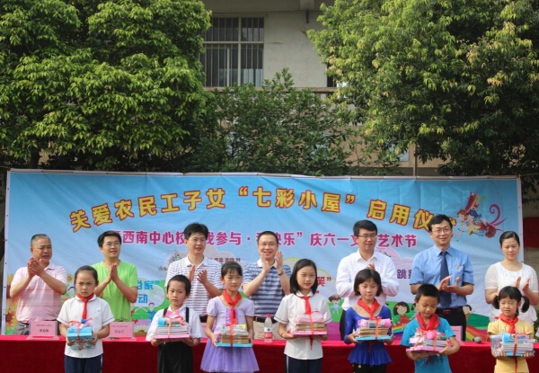 2014年5月29日上午9点,我院七大校级组织,三大媒体以及影舞社、航模协会来到西南中心校航院分校参加关爱农民工子女“七彩小屋”启动仪式暨西南小学“我参与,我快乐”庆六一艺术节。到场嘉宾有七星区区委副书记张衍平,共青团桂林市委员会副书记陈文彬,共青团七星区委员会书记董冰,桂林市教育局领导范家行,西南中心校书记李初养以及妇联,七星区检察院领导。