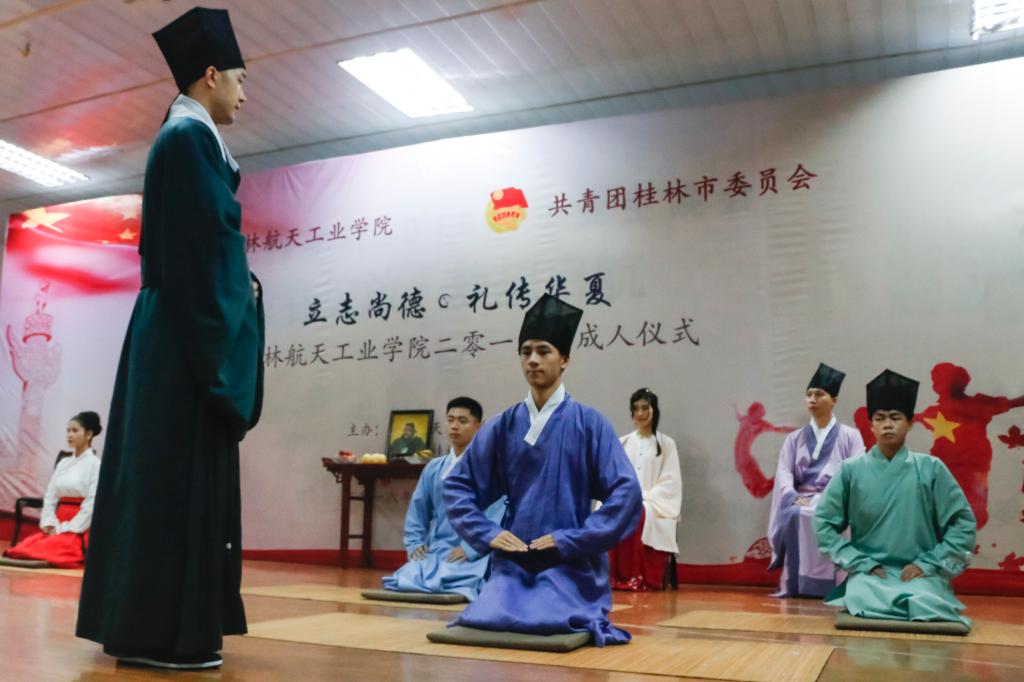 轻移莲步,直身正坐,插簪入髻,听诵行揖……5月27日上午,由团市委主办,我校承办的“立志尚德 礼传华夏”传统成人礼在北校区举行,共青团桂林市委员会副书记张圆,我校相关负责人及在校师生近400人共同见证了这场仪式。同学们一个个仪态端庄,步履缓缓,不仅惊艳了现场的观礼嘉宾,更用自己的实际行动展示了新时代的青年对传统文化的理解和热爱。