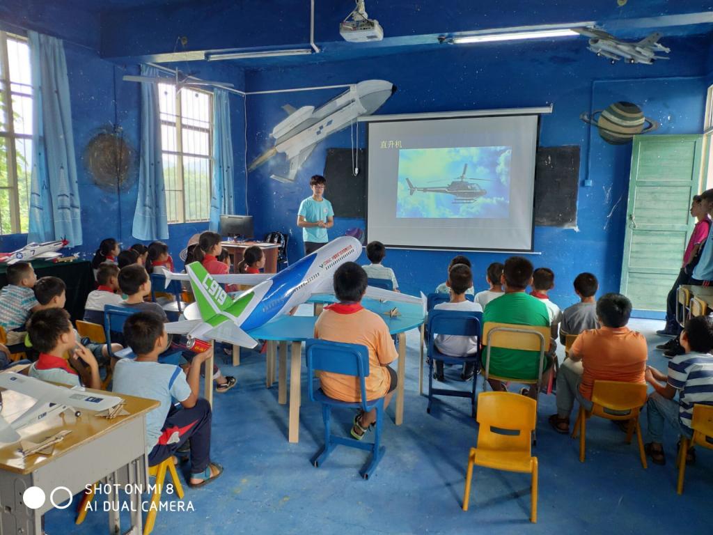 走进“航天科普活动室”中,首先是由我校艺航工作室成员手绘的航天文化主题墙,把孩子们带进了太空旅行的奇妙场景中。活动室分为展览区、阅读区、体验区和学习区四部分,配备了由大学生自主设计制作的航模飞行器、国内领先的无人机虚拟操作培训系统和五百余本少儿科普读物,增强了科技创新体验感,让孩子们寓教于乐。