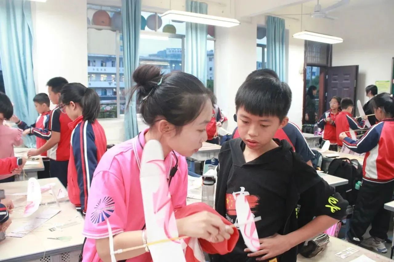 经过理论部分的介绍后,孩子们在志愿者的指导下开始进行橡皮筋飞机制作。在学习制作的过程中,孩子们认真听讲,积极参与。