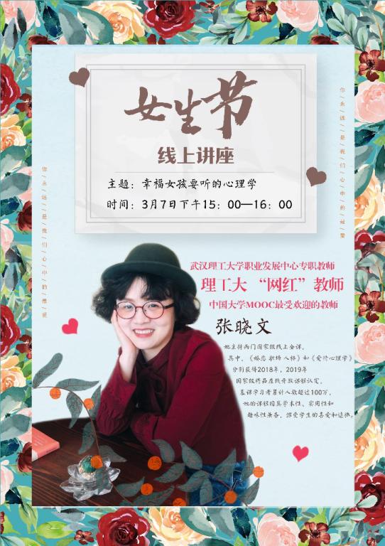 3月7日下午,武汉理工大学职业发展中心、中国大学MOOC最受欢迎的张晓文老师为我校同学们带来了一场以“幸福女孩要听的心理学”为主题的线上直播讲座。